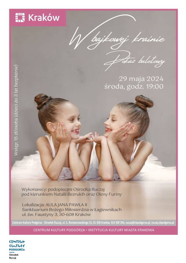 Serdecznie zapraszamy na pokazy grup baletowych Ośrodka Ruczaj, podczas których swoją tegoroczną pracę zaprezentują podopieczni Pani Natalii Bezrukih oraz Oleny Furiny.