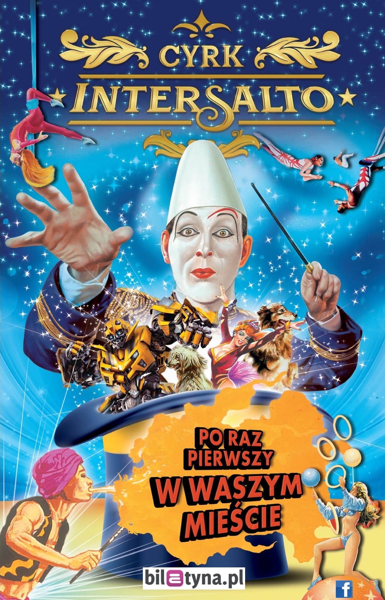 Po raz pierwszy w Waszym Mieście mamy zaszczyt zaprosić Państwa pod namioty nowego Cyrku Intersalto na fascynujące spotkanie z najprawdziwszą ze sztuk - sztuką cyrkową. Prezentujemy barwne widowisko cyrkowe dla dorosłych i dzieci z udziałem wybitnych artystów areny polskiej i gości zagranicznych. Niezapomniane wrażenia pozostawią chwile spędzone z naszymi akrobatami, żonglerami, ekwilibrystami i komikami. Będą też goście specjalni - Optimus Prime i Bumblebee - transformery pochodzące z planety Cybertron, którzy w przerwie widowiska chętnie będą pozowali do wspólnych zdjęć. Cyrk Intersalto łączy elementy tradycyjnego widowiska cyrkowego z nowoczesnym wydaniem, a wszystko dzięki odpowiednio dobranej muzyce i zastosowaniu nowoczesnego oświetlenia areny. Serdecznie zapraszamy na 2 godziny wspólnej zabawy pod magicznym namiotem Cyrku Intersalto.