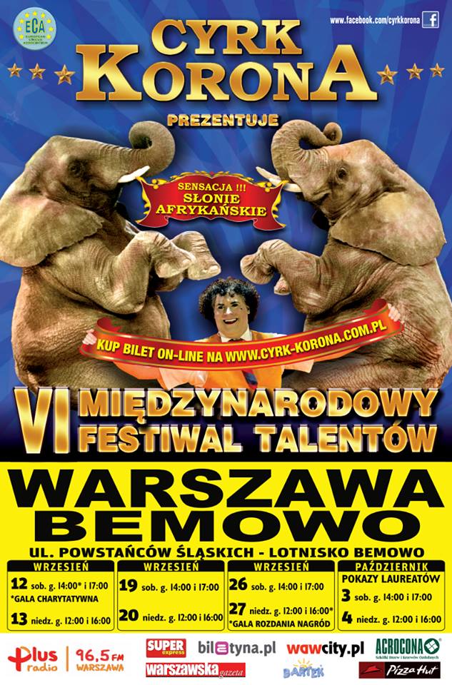Warszawskie Bemowo po raz kolejny na przełomie września i października stanie się polskim Monte Carlo, wszystko za sprawą VI Festiwalu Talentów organizowanego przez największy polski Cyrk Korona. Podczas tegorocznej edycji o statuetki Złotej, Srebrnej i Brązowej Korony oraz Grand Prix i Nagrodę Publiczności ubiegać się będą komicy, ekwilibryści, napowietrzni akrobaci, oraz prezenterzy zwierząt z różnych zakątków świata. W programie m.in.: 10-letnie mistrzynie ekwilibrystyki, akrobacje na trapezie, wirujące talerze i figlarny pies, pokaz słoni afrykańskich, ewolucje na stalowych masztach, gimnastyka napowietrzna w sieciach, wielka iluzja i lewitacje, akrobatyczna jazda na koniach oraz światowej sławy clown - JIMMY FOLCO.