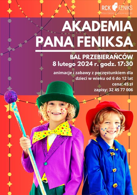 Zapraszamy wszystkie dzieciaki, z piegami lub bez, na fantastyczny bal przebierańców w Rydułtowskim Centrum Kultury “Feniks”. Czeka nas mnóstwo zabaw, animacji i klimat rodem z akademii. Na uczestników będzie czekał słodki poczęstunek - nikt nie zazna głodu, chłodu a zabawa będzie tak świetna, że nikt się nie poskarży mamie (lub tacie)! Zabawę zapewnią świetne animatorki, na polecenie samego Pana Feniksa.
