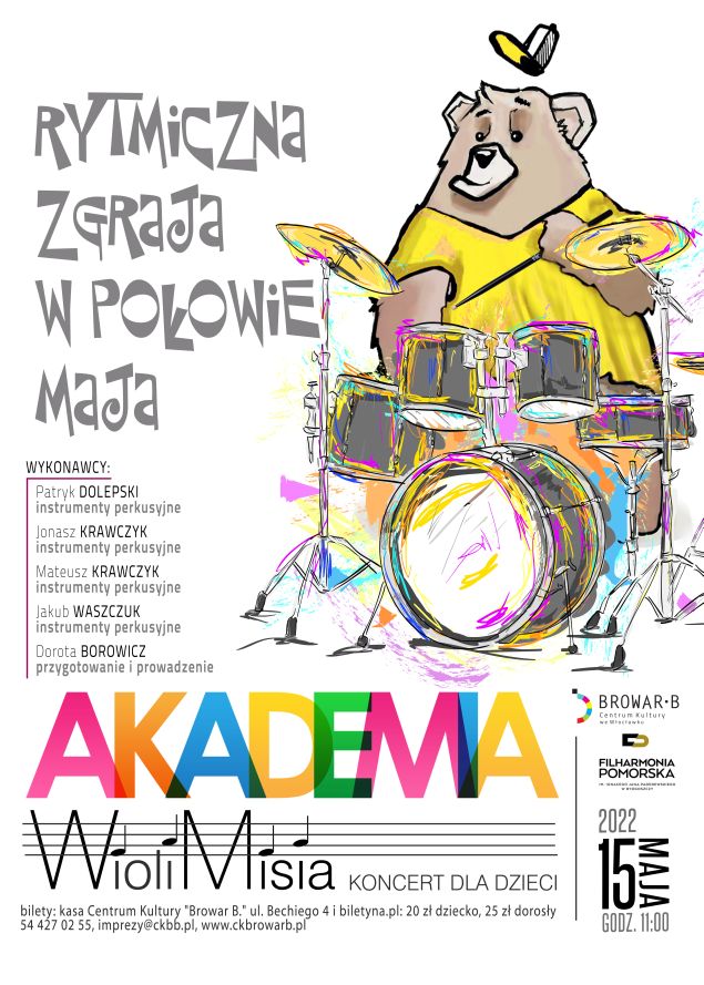 Majowy koncert Akademii WioliMisia będzie donośny, będzie radosny a nader wszystko niebanalny. Będziemy klapać, pstrykać, klaskać, tupać, opukiwać i tym sposobem, skomponujemy muzykę. Grupa instrumentów perkusyjnych odpowiedzialnych za rytm w muzyce jest najliczniejsza. Mamy kilka zadziwiających i nieco szalonych pomysłów na jej wzbogacenie. Chcemy Wam to pokazać. Zaprezentujemy zabawy rytmem, zaproponujemy sposoby na nudę deszczowych dni oraz przedstawimy silną konkurencję dla ekranów telewizorów czy komputerów. Wystąią muzycy Filharmonii Pomorskiej: Patryk Dolepski instrumenty perkusyjne, Jakub Waszczuk instrumenty perkusyjne, Jonasz Krawczyk instrumenty perkusyjne, Mateusz Krawczyk instrumenty perkusyjne, Dorota Borowicz prowadzenie.