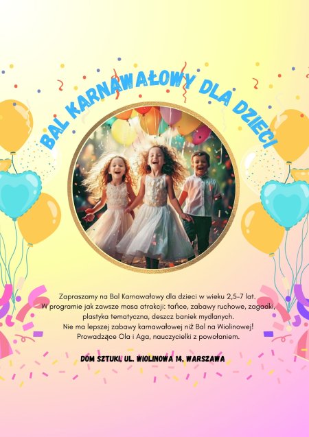 Zapraszamy na Bal Karnawałowy dla dzieci w wieku 2,5-7 lat.