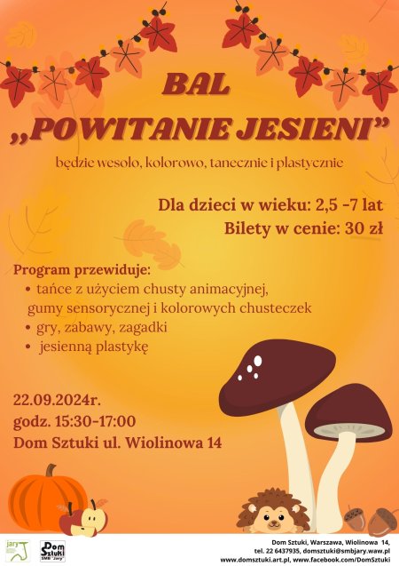 Bal „Powitanie Jesieni”,22.09,15.30-17, bilety po 30zł.