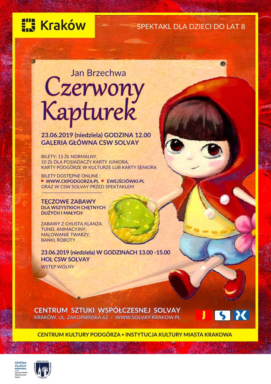 Spektakl jest adaptacją baśni o Czerwonym Kapturku, z łatwością trafia do młodego widza. Urocza dziewczynka, nosząca na głowie czerwone nakrycie, wyrusza przez las by odwiedzić babcię. Po drodze spotyka przebiegłego wilka. Jak potoczy się jej historia? Bajka niosąca ze sobą przesłanie o miłości, odwadze, lecz także o tym, że nie zawsze należy ufać obcym.