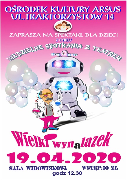 "Wielki wynalazek" to familijne przedstawienie, którego głównym bohaterem jest Prof. Mądraliński. Niestety Profesorowi, pomimo jego mądrości, jeszcze nigdy w życiu nic się nie udało. Wciąż marzy o kosmicznych odkryciach i nowych wynalazkach. Czy uda mu się stworzyć coś wielkiego? Z czego zrobić maszynę, która ma ludzkie uczucia? To odwieczne pytania Profesora. Czy pomożecie mu na nie odpowiedzieć w czasie przedstawienia?