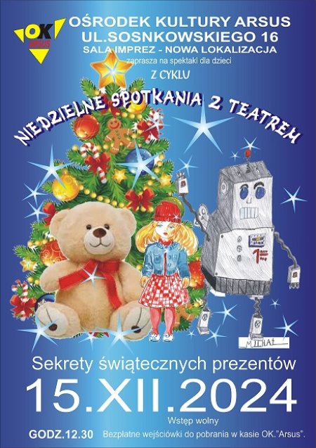 Czy słyszeliście kiedyś o tym, żeby spod świątecznej choinki zniknęły prezenty ? Poznajcie losy Pluszaka, Robota i Laleczki, którzy tak nie mogli doczekać się spotkania z dziećmi, że ruszyli w tajemniczą podróż. Jest to przedstawienie o sile emocji i relacjach, które rozkwitają nie tylko przy świątecznym stole.