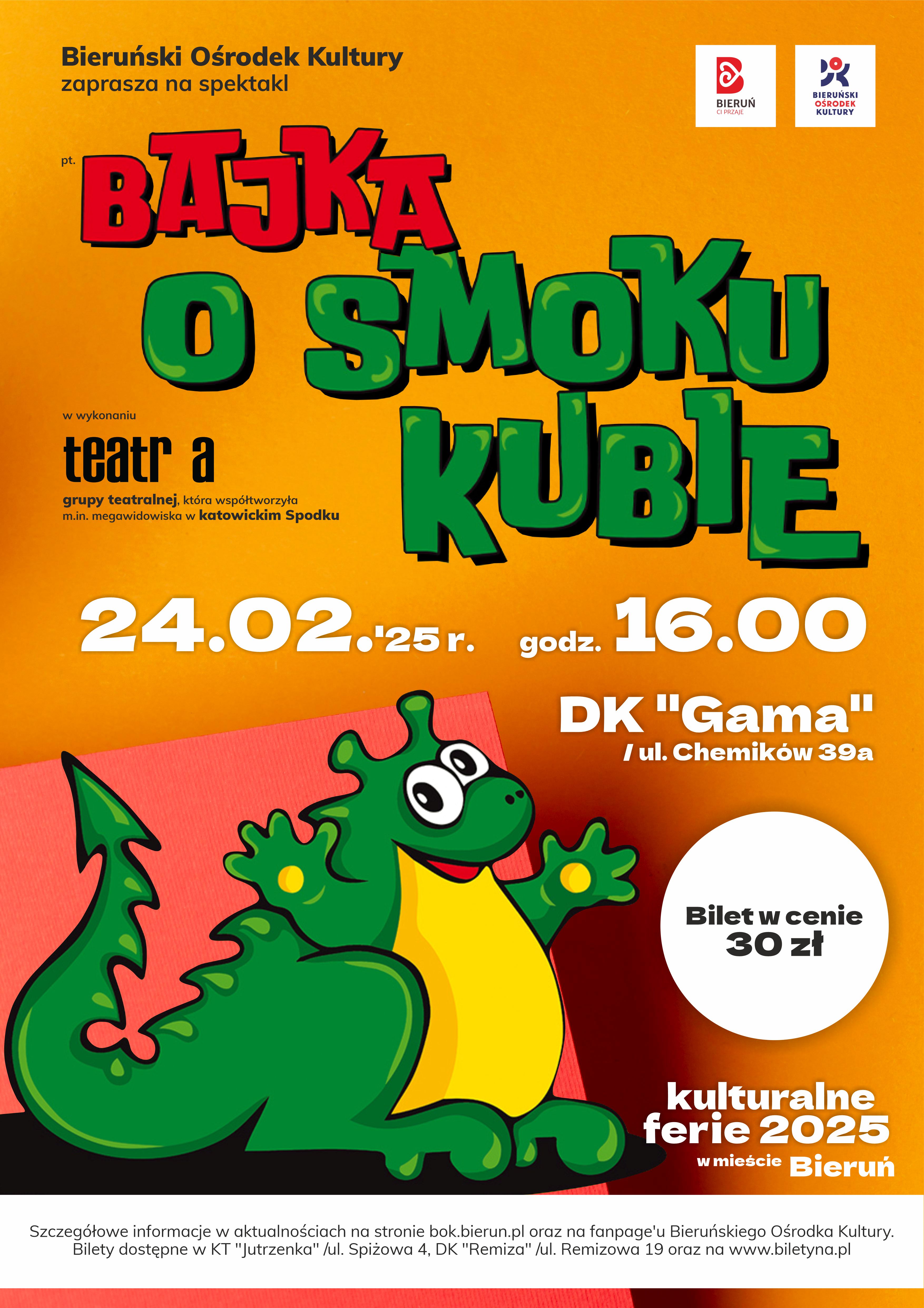 BAJKA O SMOKU KUBIE to przedstawienie dla dzieci pełne ciepłego humoru. Zabawa baśniowymi konwencjami, dyskretna kpina z przemocy oraz wyraźna afirmacja "bycia sobą", czynią dydaktyzm opowieści "łatwym do przełknięcia". Obok żywego planu w spektaklu grają lalki, konwencja baśni miesza się ze współczesnym rekwizytem, zaś żartobliwa muzyka trafnie koresponduje z działaniami rozśpiewanych i roztańczonych bohaterów. Przesłanie historii będące afirmacją "bycia sobą" zostało wyartykułowane językiem klasycznej bajki. Są tu wyraźnie zarysowane postaci. Jest konflikt. Jest wreszcie wyraźna puenta. No i jest to, co dzieci lubią najbardziej - smoki. Zabawna historia opowiada o dobrodusznym smoku, od którego wszyscy domagają się, żeby był (jak przystało na prawdziwego smoka) okrutny i zły. Kuba jednak nie ma na to najmniejszej ochoty. Śpiewa z żabami, a w wolnych chwilach wysyła mieszkańcom królestwa życzenia wypisane na latawcach. Pewnego dnia w kraju wybucha wojna - do granic państwa zbliża się okrutny wojownik Brumbrun. W noc poprzedzającą starcie wszyscy mieszkańcy królestwa uciekają za granicę, zostawiając na pastwę wroga dwie księżniczki (o których w popłochu zapomniano). Z opresji ratuje młode damy smok Kuba, swoją dobrodusznością rozbrajając (także w dosłownym tego słowa znaczeniu) Brumbruna.