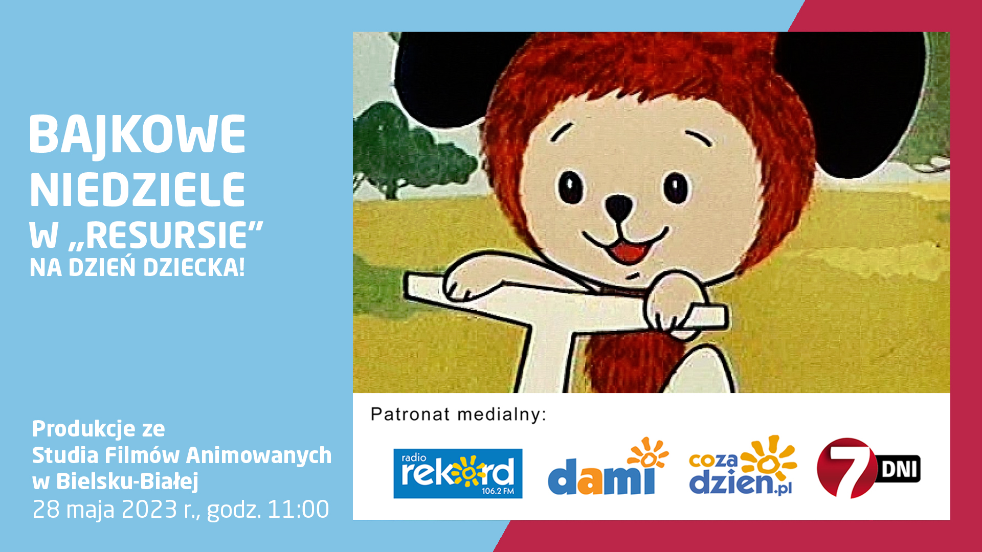 Dzień Dziecka zbliża się wielkimi krokami. Z tej okazji podczas Bajkowej niedzieli odbędzie się projekcja bajek animowanych znanych chyba każdemu. Nasi najmłodsi widzowie będą mieli okazję obejrzeć na dużym ekranie produkcje ze Studia Filmów Animowanych w Bielsku-Białej. Po seansie na dzieci czeka wiele atrakcji, aby mogły spędzić czas w Resursie na jak najlepszej zabawie.
