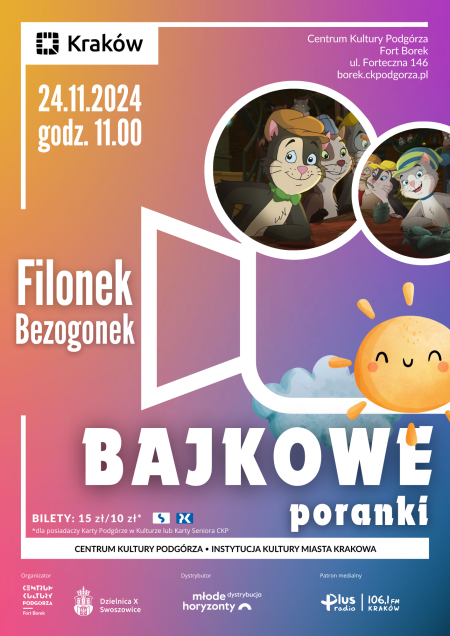 Zapraszamy na seans pt. „Filonek Bezogonek” w ramach Bajkowych Poranków, który odbędzie się 24.11.2024 o godz.11.00.