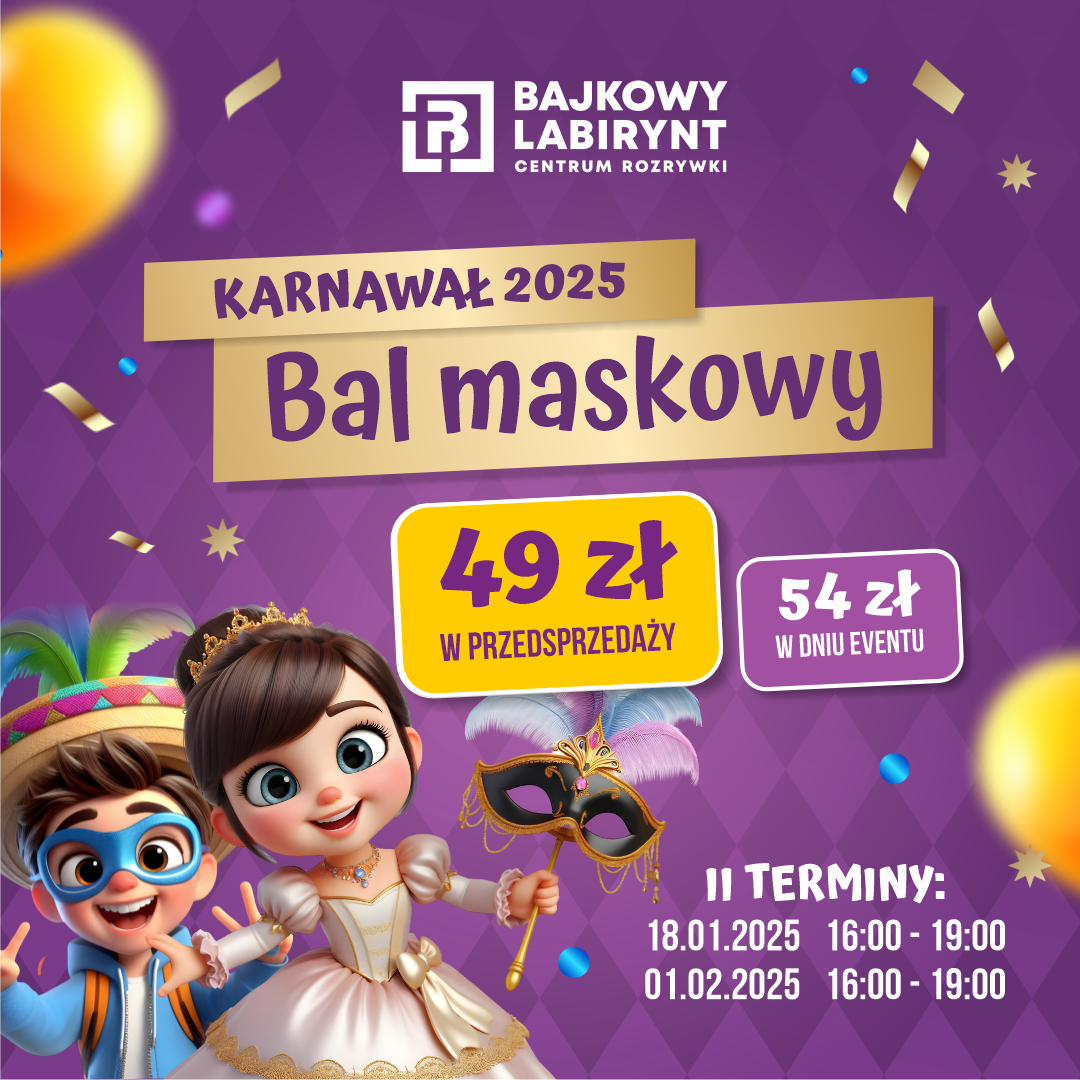 Centrum Rozrywki Bajkowy Labirynt zaprasza dzieci od 4 r.ż (młodsze pod opieką dorosłych) na niezapomniany Bal Maskowy 🤩🥰 Wydarzenie zaplanowane i całkowicie przystosowane do najmłodszych. Bezpieczna przestrzeń sali zabaw oraz najlepsi animatorzy gwarantują super zabawę i moc atrakcji 🎉