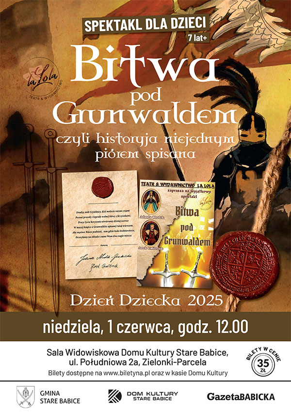 Spektakl "Bitwa pod Grunwaldem czyli historyja niejednym piórem spisana" to prawie godzinna wierszowana opowieść o Bitwie pod Grunwaldem, która nie była tylko jedną z wielu w historii naszego kraju. Była walką, która urosła do rangi symbolu. Spektakl wyjątkowy, który jednocześnie bawi i uczy. Dedykowany dzieciom od 7 lat do 107 J