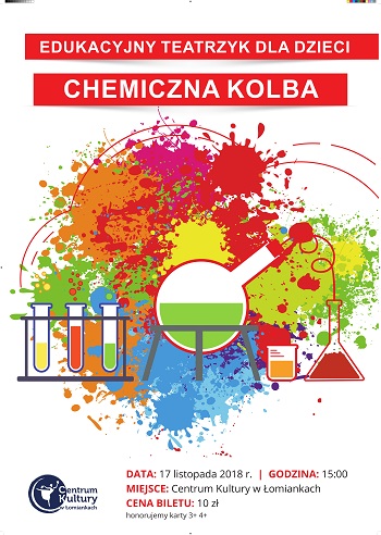 Kwasy, zasady, wiązania, ekstrakcja, dysocjacja… jednym słowem - chemia. Może być zabawna i kolorowa, a czasem nawet wybuchowa - można się bawić, ale trzeba uważać! Centrum Kultury w Łomiankach zaprasza wszystkie dzieci 17 listopada 2018 na edukacyjny teatrzyk pt. Chemiczna Kolba.