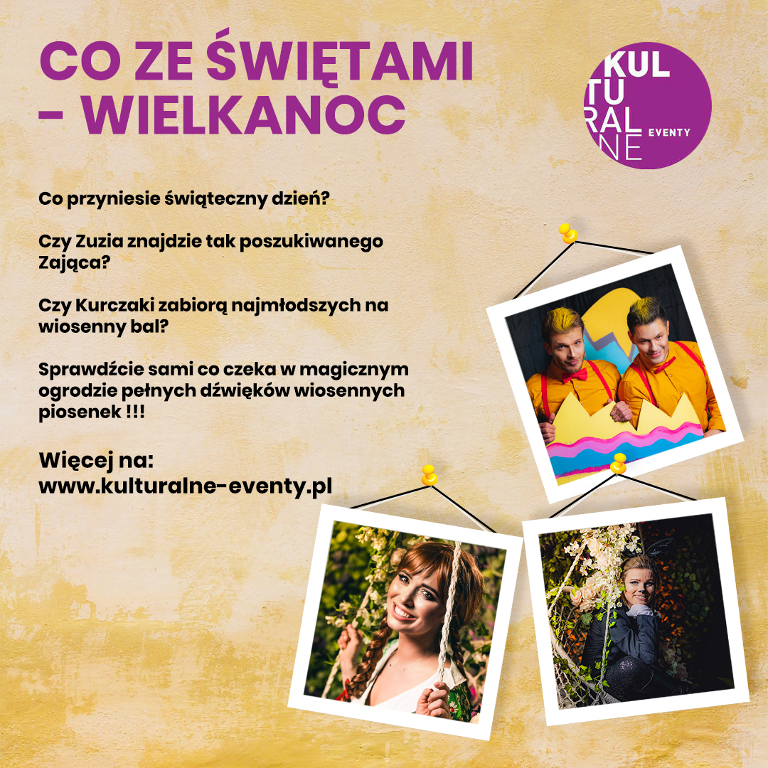 "Co ze Świętami"- Wielkanoc. Nasi bohaterowie przeniosą nas w do magicznego ogrodu małej dziewczynki Zuzi. Krzaki, klomby, kwiaty... huśtawka... Nieopodal, spotkamy dwa kurczaki grające w szachy. Co przyniesie świąteczny dzień? Czy Zuzia znajdzie tak poszukiwanego Zająca? Kurczaki zabiorą najmłodszych na wiosenny bal...Sprawdź sami co czeka w magicznym ogrodzie pełnych dźwięków wiosennych piosenek. Spektakl dla całych rodzin z maluchami od 4 lat. Opowieść o przyjaźni, rodzinie w pełnej śmiesznych sytuacji atmosferze.