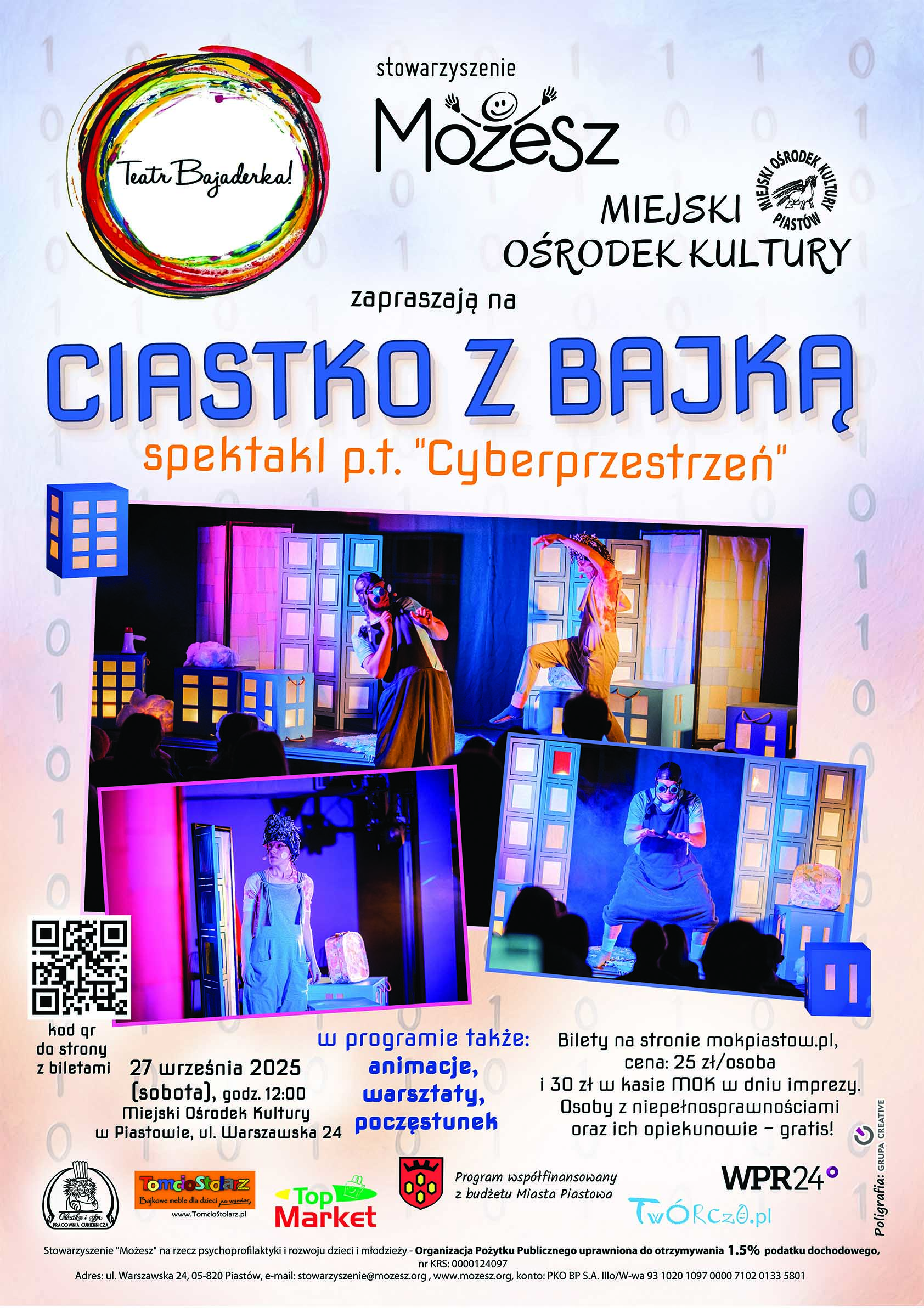 Coraz częściej coraz młodsze dzieci sięgają po telefony komórkowe i tablety. W spektaklu CYBERPRZESTRZEŃ, znanego i lubianego Teatru Bajaderka, dzieci na własne oczy zaobserwują jak może wyglądać świat, kiedy nadużywa się nowych technologii, a zapomina o relacjach z rodziną i przyjaciółmi. Zobaczymy dlaczego warto dziś rozwijać swoją wyobraźnię oraz w jakiej rzeczywistości lepiej przebywać: wirtualnej czy realnej.