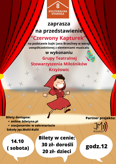 „Czerwony Kapturek” na podstawie bajki Jana Brzechwy to w wykonaniu Grupy teatralnej SMK to uczta nie tylko dla dzieci, które reagują spontanicznie na to, co dzieje się na scenie, ale i dorosłych, którzy niespodziewanie przenoszą się w świat dzieciństwa. Środki wyrazu, efekty, taniec, śpiew, kostiumy, scenografia – wszystko to składa się na widowisko teatralne, które wprawia widzów w niepowtarzalny nastrój. W poszczególne role wcielają się: