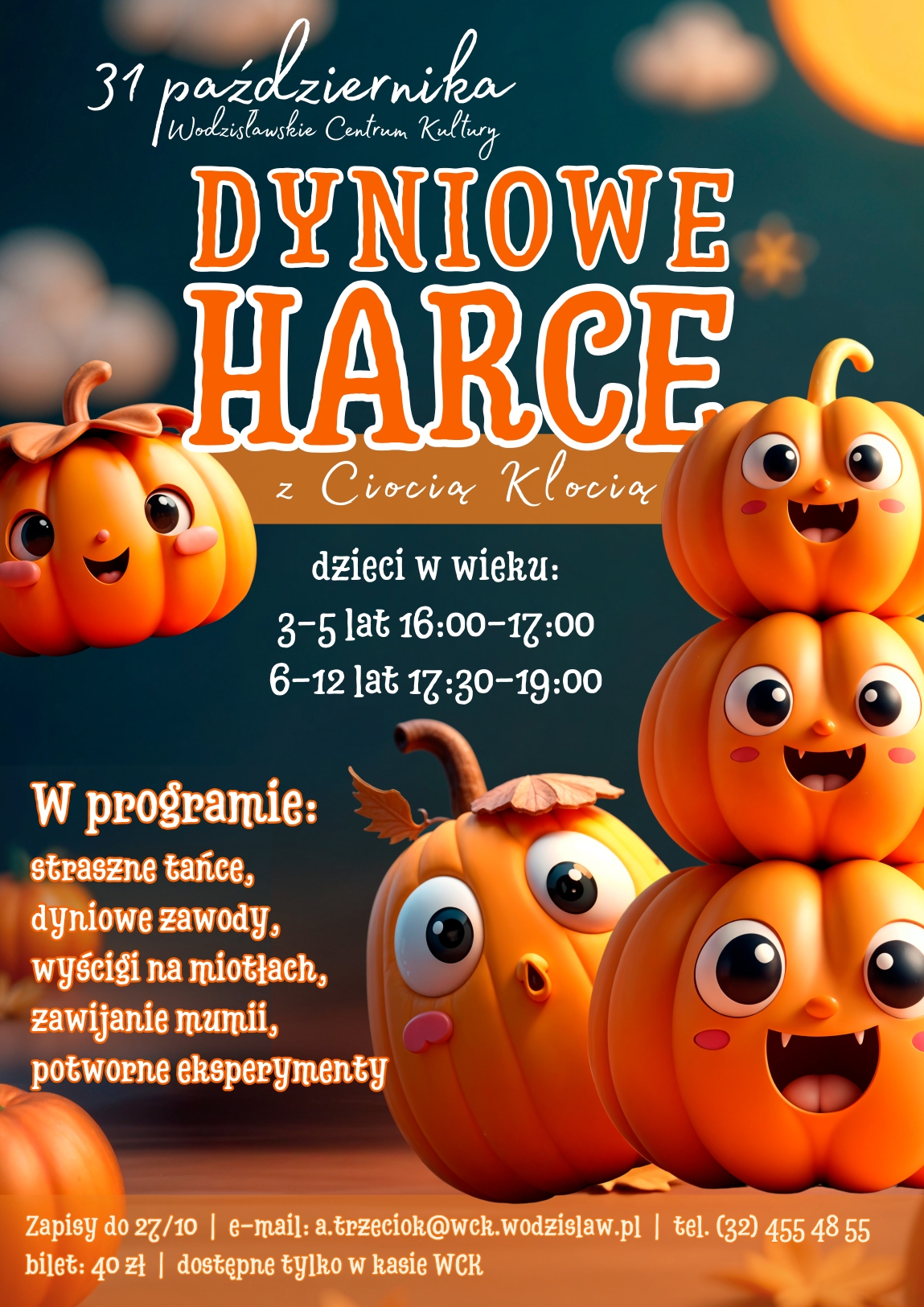 Wodzisławskie Centrum Kultury wraz z Ciocią Klocią serdecznie zapraszają na „Dyniowe harce”! Kiedy? Już w piątek, 31 października. Zatem jeśli szukacie ciekawego, a razem wystrzałowego pomysłu na jesienną imprezę dla dzieci, to ta propozycja przypadnie Wam do gustu. Będzie wesoło i kreatywnie, a na uczestników czekać będzie moc atrakcji!