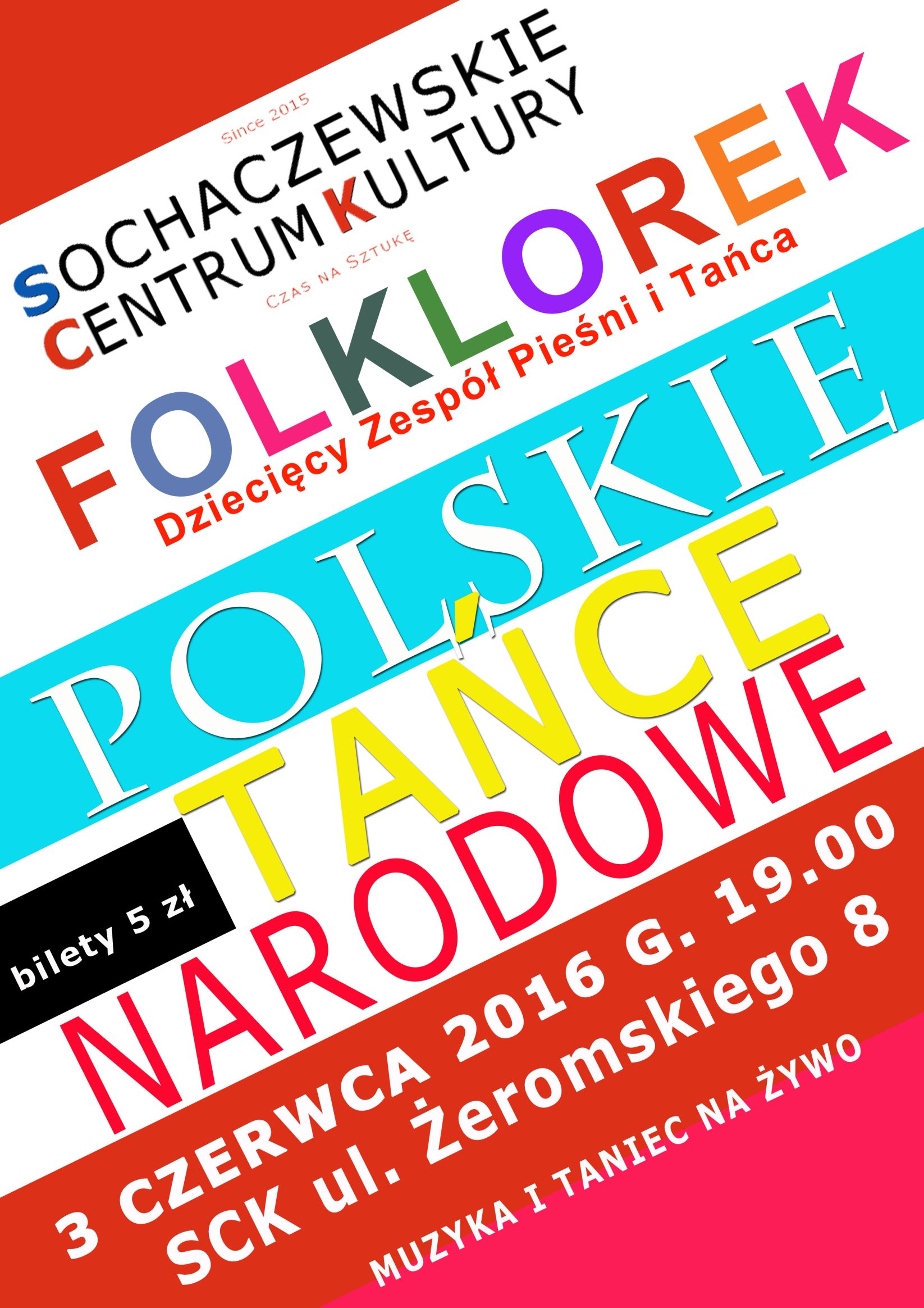 Sochaczewskie Centrum Kultury przy ul. Żeromskiego 8 zaprasza w piątek, 3 czerwca 2016 r. o godz.19.00 na występ Dziecięcego Zespołu Pieśni i Tańca FOLKLOREK. W programie koncert: „Polskie Tańce Narodowe” – występ dzieci i muzyka grana na żywo.