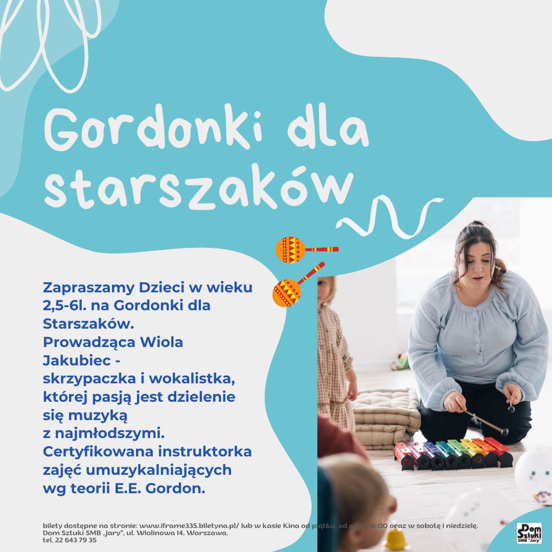 Gordonki dla starszaków to zajęcia muzyczne dla dzieci w wieku 2,5-6 lat inspirowane rewolucyjną teorią uczenia się muzyki stworzoną przez profesora Edwina Elisa Gordona. Odkrył on, że muzyki można nauczyć się tak, jak języka mówionego. Podczas zajęć gordonowskich dzieci najpierw osłuchują się z różnorodnymi dźwiękami, jest też przestrzeń na wspólną zabawę i ruch. Zajęcia rozwijają zainteresowania muzyczne dzieci, poszerzają wiedzę o instrumentach. Podczas zajęć dzieci mogą zagrać na instrumentach perkusyjnych, a także usłyszeć skrzypce, ukulele, dzwonki czy flet.
