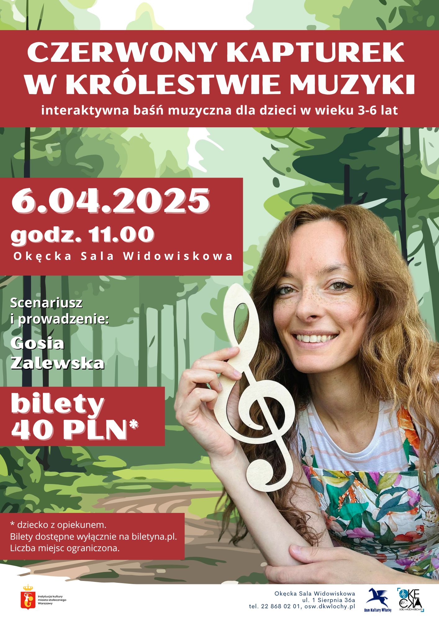 Znacie opowieść o Czerwonym Kapturku, który idzie w odwiedziny do babci i spotyka wilka, prawda? Tym razem Kapturek wędruje przez Muzyczny Las i po drodze czeka na niego dużo wesołych przygód. Wilk także tam jest, ale wcale nie zły, a bardzo ciekawski i zna się na żartach. Czy Babcia doczeka się dziewczynki z koszyczkiem pyszności zanim pójdzie spać? Jeśli przyjdziecie pomóc jej w wykonaniu muzycznych zadań, to na pewno wszystko pójdzie zgodnie z planem.