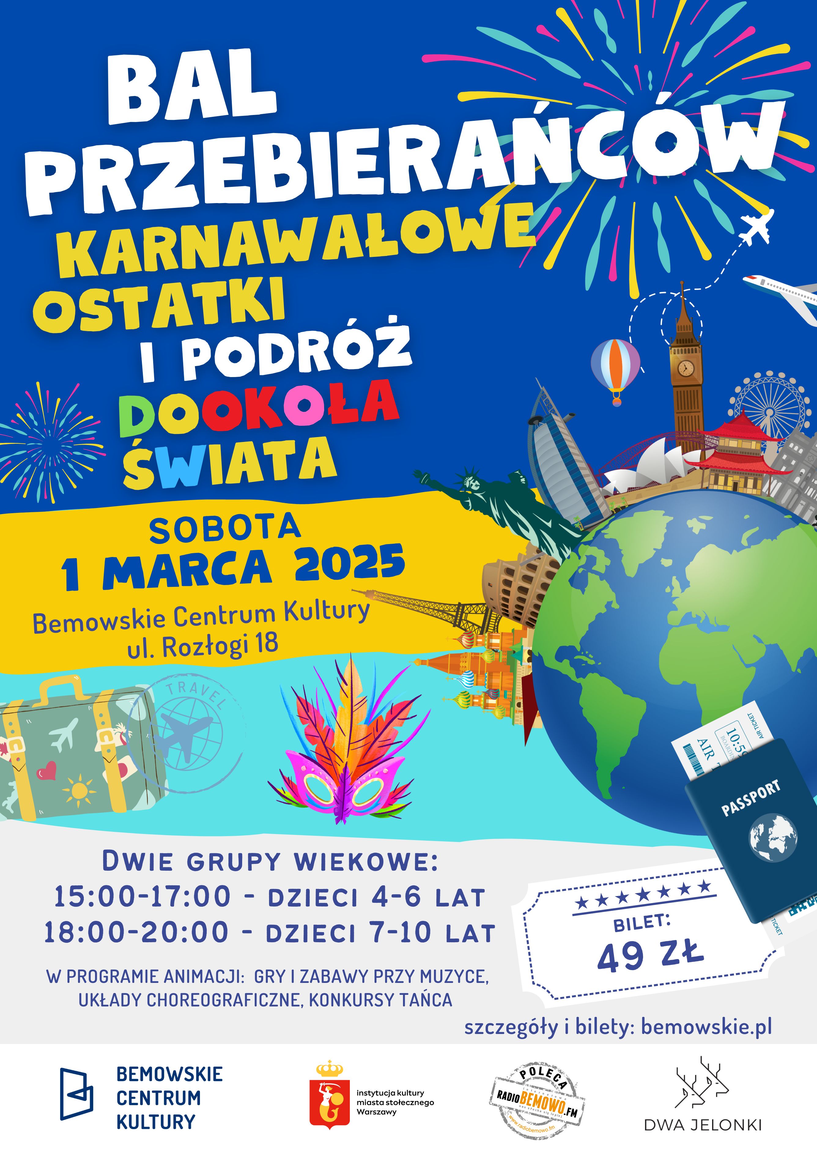 Zapraszamy wszystkie dzieci na ostatni w tym karnawale bal przebierańców. Tego dnia Bemowskie Centrum Kultury przy ul. Rozłogi 18 zamieni się w kolorową salę taneczną pełną atrakcji dla najmłodszych. Czekają Was, gry i zabawy przy muzyce, układy choreograficzne, konkursy tańca, poczęstunek i świetna zabawa.