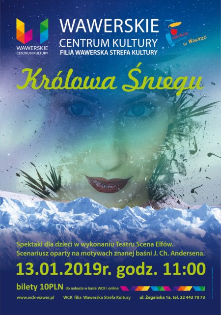 Zapraszamy na muzyczno-plastyczny spektakl "Królowa Śniegu" w wykonaniu Teatru "Scena Elffów". Scenariusz oparty na motywach baśni H. Ch. Andersena. Niezwykła historia o miłości rodzeństwa - Kaja i Gerdy.