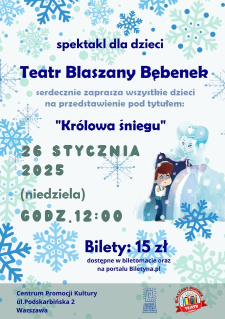 „Królowa śniegu” to interpretacja baśni Hansa Christana Andersena o tym samym tytule. Spektakl przedstawia losy zaginionego chłopca i dziewczynki, która za wszelką cenę pragnie go odnaleźć. Siła przyjaźni i upór w dążeniu do celu to nie wszystko, co możemy tutaj zobaczyć. Podróże małej Gerdy można będzie nie tylko obejrzeć, ale również wziąć w nich czynny udział. Dzieci pomogą dziewczynce pokonać wiele trudności, by w końcu odnaleźć najlepszego przyjaciela i uratować go z lodowego pałacu tytułowej Królowej śniegu. Serdecznie zapraszamy do wspólnej baśniowej przygody!