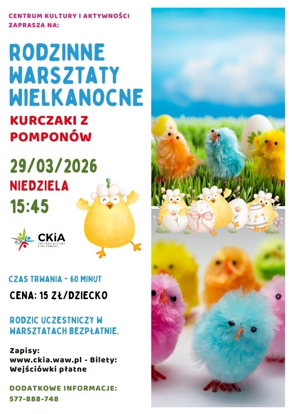 Zapraszamy dzieci w wieku 5–13 lat na warsztaty tworzenia kurczaków z pomponów. Będzie skręcanie, formowanie, ozdabianie i dużo śmiechu.