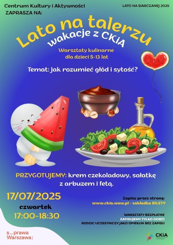 Czy dzieci wiedzą, kiedy naprawdę są głodne, a kiedy mają tylko apetyt? Podczas warsztatów porozmawiamy o głodzie i sytości, a także wspólnie przygotujemy krem czekoladowy oraz orzeźwiającą sałatkę z arbuzem i fetą.