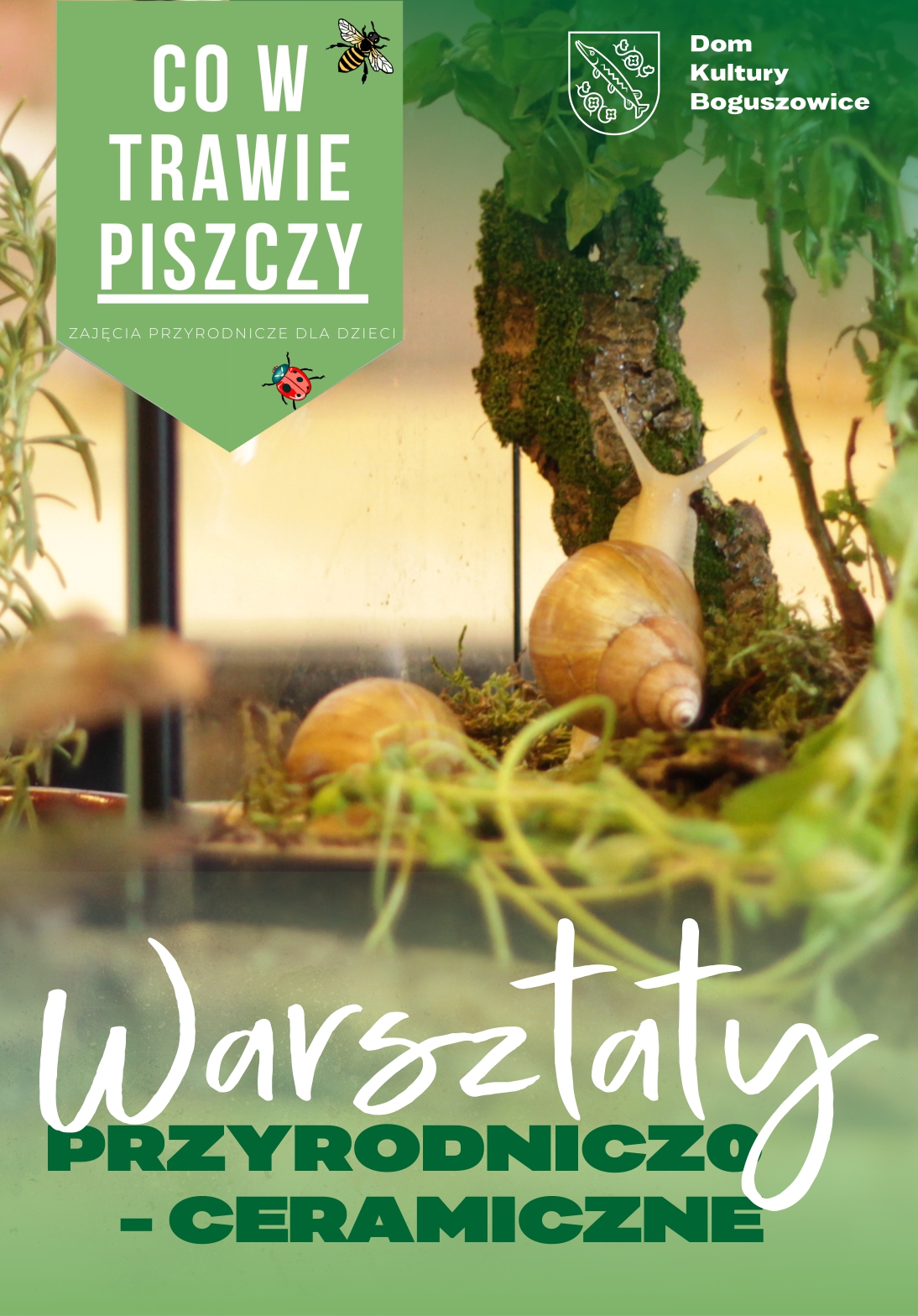 Zapraszamy miłośników przyrody na spotkanie z wielkim ślimakiem afrykańskim. W ramach warsztatu przyrodniczego poznacie także różnorodność i użyteczność świata owadów, ptaków i łąk polskich. Wspólnie odkryjemy na czym polega zależność elementów przyrody od człowieka oraz szkodliwość jego oddziaływania na ekosystem. Na finał ulepimy ślimaki z gliny.