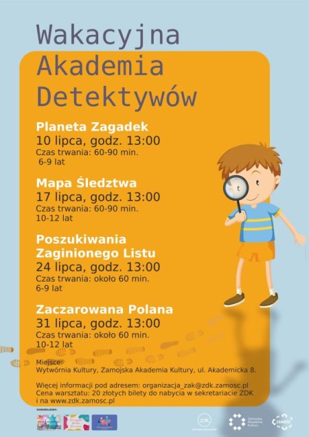 W te wakacje zapraszamy dzieci na czwartkowe warsztaty w Zamojskiej Akademii Kultury, gdzie przeniosą się do świata pełnego tajemnic, zagadek i niezwykłych przygód! Czy mają w sobie ducha detektywa? Czy potrafią połączyć tropy, odkryć sekrety i rozwiązać zagadkę, zanim czas dobiegnie końca?