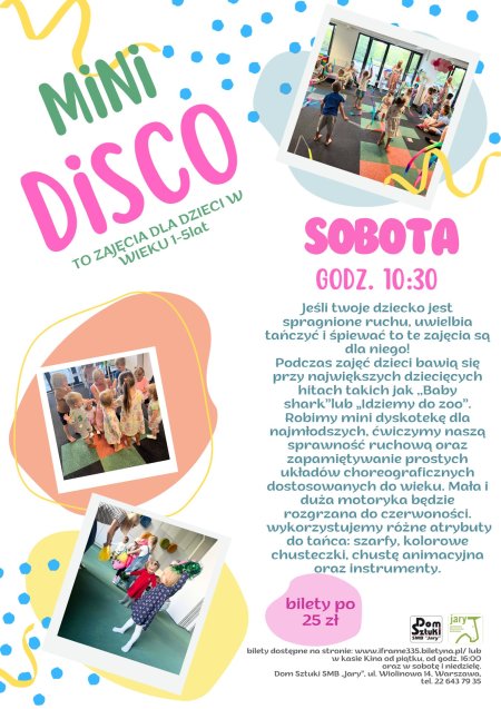 Dla kogo?? -na zajęcia zapraszamy tak na prawdę od momentu kiedy dziecko ��♂️zacznie przygodę z chodzeniem. To doskonały czas na oswojenie się z muzyka �ale tez motywacja do doskonalenia nauki chodzenia -dzieci �2 letnie zaczynaja powtarzać za nami ruchy naśladują mimikę oraz zapamiętują kolejność utworów - dzieci 3 i 4 letnie tańczą ��zazwyczaj już bez obecności rodzicow i śpiewają z nami piosenki, które znają. ❓Dlaczego akurat Mini Disco??�♂️ - bo to zajęcia dla dzieci lubiących taniec�♀️ i ruch, które słysząc pierwsze takty muzyki���� zaczynaja poruszać w jej rytm. -angażują zmysły dziecka do pracy -socjalizują z innymi dziecmi��♀️�♂️�� -uczą rytmu, kroków ,nowych słów ,liczenia, cierpliwości -dają dziecku sporo radości i możliwość uzewnętrznienia swoich emocji� -wykorzystywane w zajęciach chusteczki, szarfy gimnastyczne, marakasy i pompony pozwalają dziecku wejść w kolorowy świat przeżyć. Często są tez taką formą przełamania bariery wstydu dziecka. Na zajeciach do niczego nie zmuszamy, dziecko samo decyduje czy ma ochotę wziąć udział w tańcu, zabawie. Dlatego ważne jest aby rodzic ���brał czynny udział w zajeciach bo dziecko naśladuje dorosłego. Kiedy zobaczy ze mama�❤️� czy tata świetnie bawi się na zajeciach dla niego one tez będą czymś ciekawym.