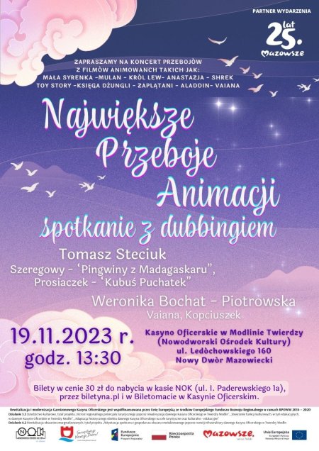 Nowodworski Ośrodek Kultury zaprasza najmłodszych na koncert przebojów z filmów animowanych takich jak: „Mała Syrenka”, „Mulan”, „Król Lew”, „Anastazja”, „Shrek”, „Toy Story”, „Księga Dżungli”, „Zaplątani”, „Aladyn”, „Vaiana” i inne.