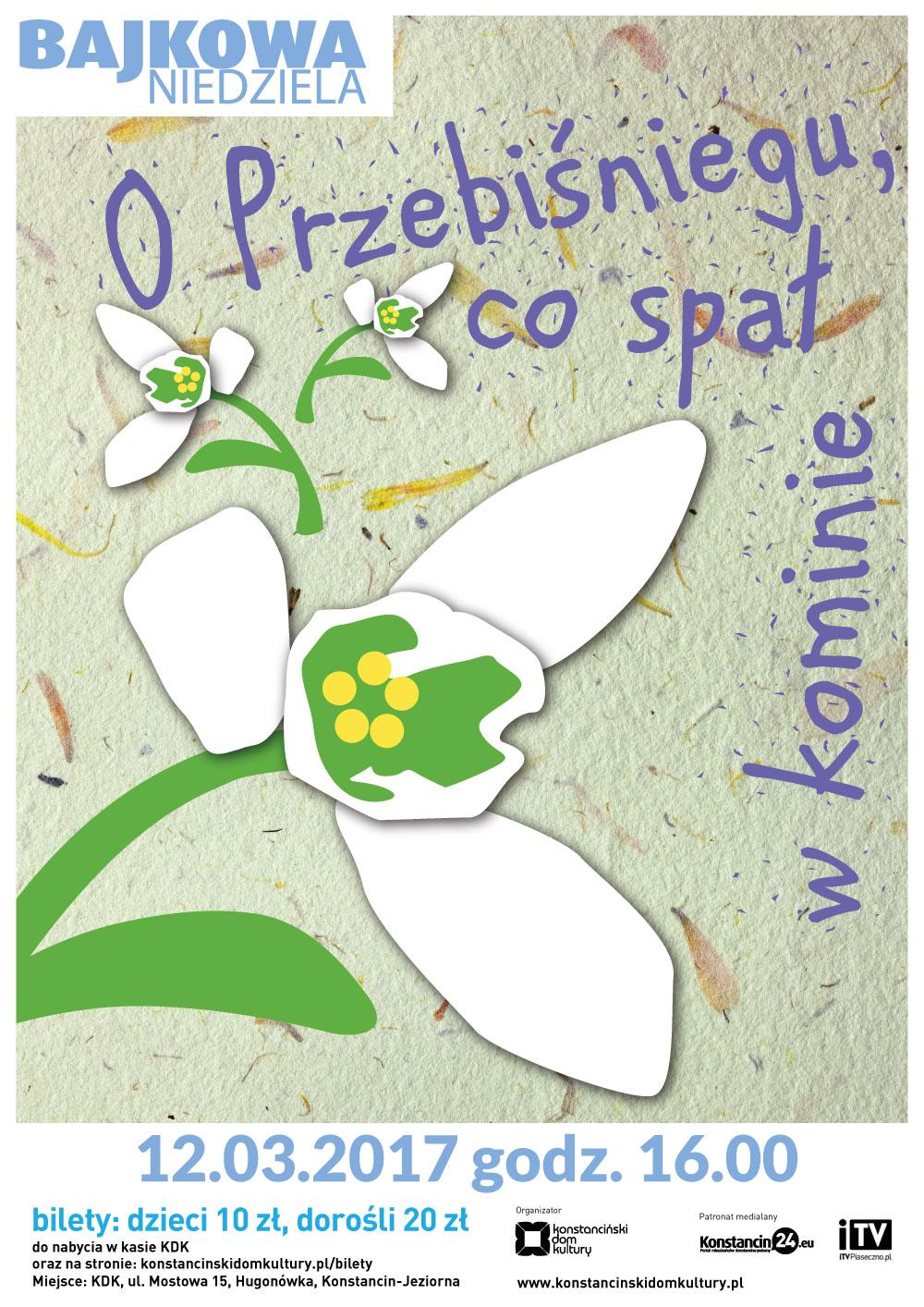 O Przebiśniegu, co spał w kominie to opowieść Teatru Jumaja o umiejętności rozpoznawania dobra i zła, prawdy i kłamstwa oraz prawdziwej miłości. Zabawne i pouczające przedstawienie wprowadza dzieci oraz rodziców we wspaniały nastrój rozkwitającej wiosny. Głównym bohaterem jest bardzo zamożny i władający potężnym królestwem Król Dobromił, który nie był pewien szczerości swoich poddanych. Postanawia więc wyruszyć w świat w poszukiwaniu najważniejszych wartości: dobra, prawdy i miłości. Podczas wyprawy ma niesamowite przygody i spotyka wiele barwnych postaci. Spektakl wyróżniają barwna scenografia, różnorodne, wspaniałe kostiumy, idealnie dobrana muzyka oraz pełna pasji i zaangażowania gra zawodowych aktorów. Wartka akcja oraz wciągająca i pouczająca fabuła zapewnia świetną, rodzinną zabawę.