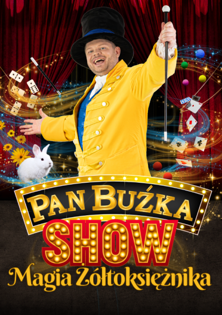 Pan Buźka Show to spektakl, w którym magia łączy się z szaleństwem, a prezentowane triki przekraczają granicę rzeczywistości, dostarczając wspaniałej zabawy dla całej rodziny. Przygotujcie się na prawdziwą paletę emocji: od śmiechu po zachwyt i dajcie się porwać niebanalnej, angażującej i momentami abstrakcyjnej rozrywce w wykonaniu jedynego na świecie Żółtoksiężnika. Pan Buźka wyczaruję coś z niczego, sprawi że przedmioty, a nawet i ludzie zaczną unosić się w powietrzu, nie raz i nie dwa odgadnie Wasze myśli, a także pojawi prawdziwego królika na scenie! A to jeszcze nie koniec! Tutaj widzowie są częścią przedstawienia, dlatego macie szansę zostać zaproszeni na scenę, gdzie na własnej skórze poczujecie moc żółtej magii z bliska.