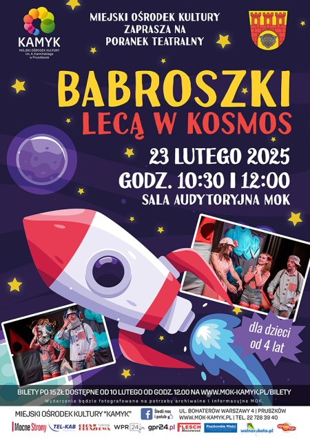 „Babroszki lecą w kosmos” (przedstawienie interaktywne) - jest to historia stworów-Babroszków, które pewnego dnia postanawiają wylecieć w kosmos. W podróż zabierają dzieci a po awaryjnym lądowaniu na Księżycu przyjdzie im stawić czoło groźnemu Hrabiemu Robotowi i oswobodzić mieszkańców Moonowa spod jego władzy. W przedstawieniu wykorzystano motywy ze znanych filmów oraz bajek.