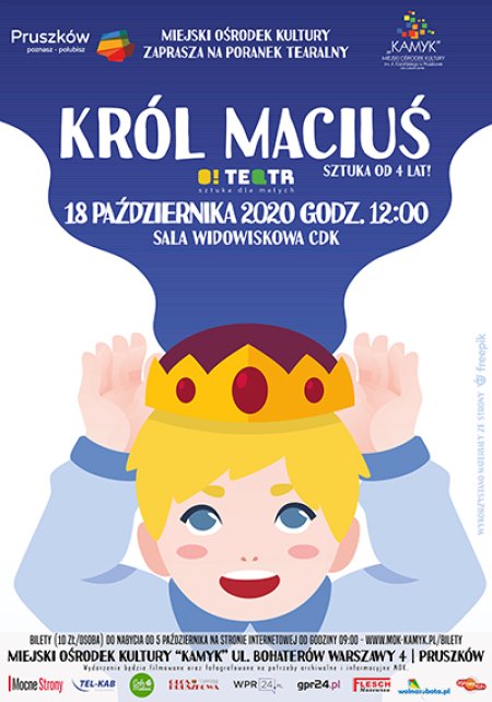 „Król Maciuś” – spektakl opowiada historię małego chłopca, który w wieku 10 lat musiał stanąć na czele swojego królestwa w bardzo odpowiedzialnej roli króla. W czasie bajki dzieci przekonają się, że dorosłość nie jest taka beztroska jak nam się wydaje. Wcale nie można robić czego się tylko chce, a już na pewno nie jest tak, że nikogo nie trzeba pytać o zdanie. Trzeba pamiętać, że wszystko co robimy niesie za sobą jakieś konsekwencje także dla innych. Przedstawienie uczy rzeczy ważnych w trakcie wspaniałej zabawy. Jest w nim mnóstwo humoru i wspólnego działania, bo jak się okaże wspólnymi silami można zdziałać naprawdę wiele.