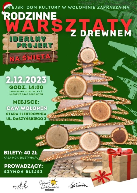 Miejski Dom Kultury w Wołominie serdecznie zaprasza na wyjątkowe RODZINNE WARSZTATY Z DREWNEM, które odbędą się w CAW - Stara Elektrownia, przy ul. Daszyńskiego 3. To doskonała okazja, aby spędzić twórczy czas z najbliższymi i przygotować wyjątkowe ozdoby świąteczne z drewna.