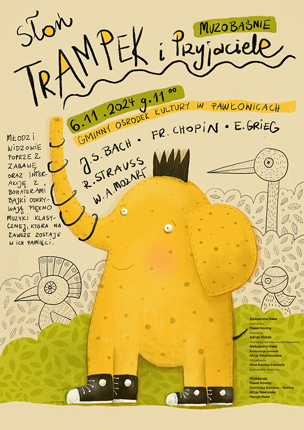 Spektakl pt. "Słoń Trampek i przyjaciele" jest przeznaczony dla grup szkolno-przedszkolnych / dzieci w wieku od 5 - 11 lat. Jest to spektakl upowszechniający muzykę klasyczną, a jego misja to budowanie młodej publiczności poprzez zapoznanie jej z arcydziełami muzyki klasycznej oraz z trzema jazzującymi autorskimi piosenkami. Spektakl promuje wartości takie jak przyjaźń, pomoc drugiemu w potrzebie. Tytułowy bohater Słoń Trampek wyrusza do krainy Nadziei, gdzie z pomocą Jaskółki Emmy pragnie odczarować swoją trąbę.