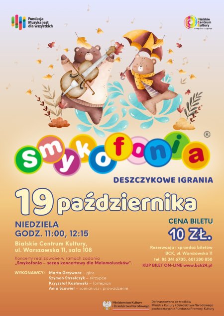 Koncert na pluskania, chlupoty, strumyczki i smyczki, a także fortepianowe struny, które nam zagrają pioruny i preludium Des(zcz)-dur Fryderyka Chopina. Jedno jest pewne – w czasie deszczu smykodzieci się nie nudzą, czasem nucą, czasem tulą i tańczą razem z rodzicami. A muzyka Agnieszki Widlarz, Jerzego Wasowskiego i Antonio Vivaldiego wprowadzi nas w pogodny nastrój. Chodźcie!