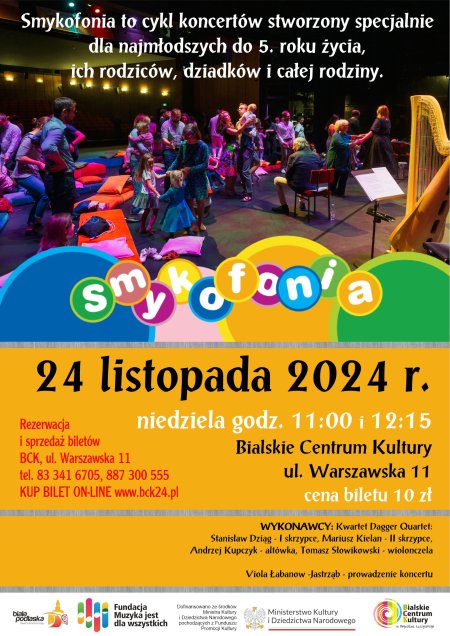 Smykofonia to cykl koncertów stworzony specjalnie dla najmłodszych do 5. roku życia, ich rodziców, dziadków i całej rodziny. To wyjątkowa okazja, aby wspólnie odkrywać piękno muzyki i rozwijać muzyczne zdolności najmłodszych.Inspiracją dla Smykofonii są renomowane instytucje muzyczne z Europy i Ameryki Północnej, które od lat organizują koncerty dla najmłodszych. Badania naukowe potwierdzają, że wczesny kontakt z muzyką pozytywnie wpływa na rozwój dziecka.