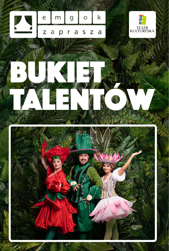 „Bukiet Talentów” to wspaniały rozśpiewany interaktywny spektakl dla dzieci, pełen pięknej muzyki, ruchu i animacji. To 60 minut dobrej zabawy z pełnymi energii bohaterami spektaklu – Stokrotką, Różą i Kaktusem. Spektakl porusza ekologiczne tematy, takie jak: recykling, segregacja odpadów i prawidłowe nawyki ekologiczne. Dzieci w śpiewający sposób powtórzą zasady segregacji i nauczą się, jakie surowce możemy ponownie przetwarzać. Kwiaty pokażą najmłodszym, jak żyć ekologicznie i jak dobrze się bawić! Przedstawienie przygotowane jest w konwencji show, pełnego muzyki, zabaw i interakcji z dziećmi. W spektaklu wykorzystywane są tylko autorskie utwory muzyczne Teatru Kultureska.