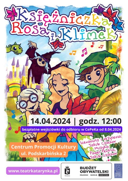 Spektakl sfinansowany ze środków Budżetu Obywatelskiego na 2024 rok w ramach projektu „Bajkowa Praga-Południe - bezpłatne spektakle teatralne dla dzieci”.