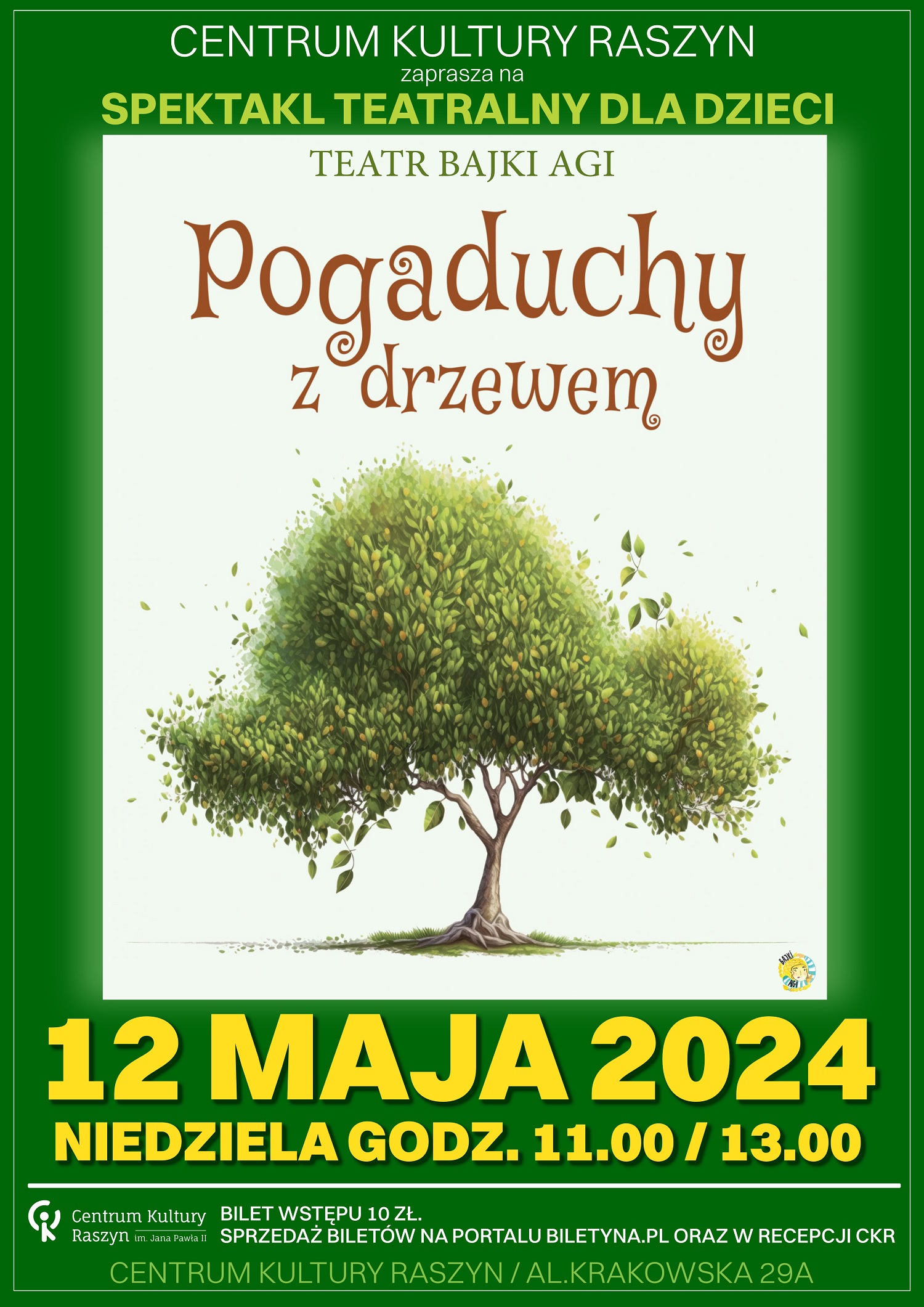 Centrum Kultury Raszyn zaprasza dzieci od lat 3 wraz z opiekunami na spektakl "Pogaduchy z drzewem" w wykonaniu Teatru BAJKI AGI.