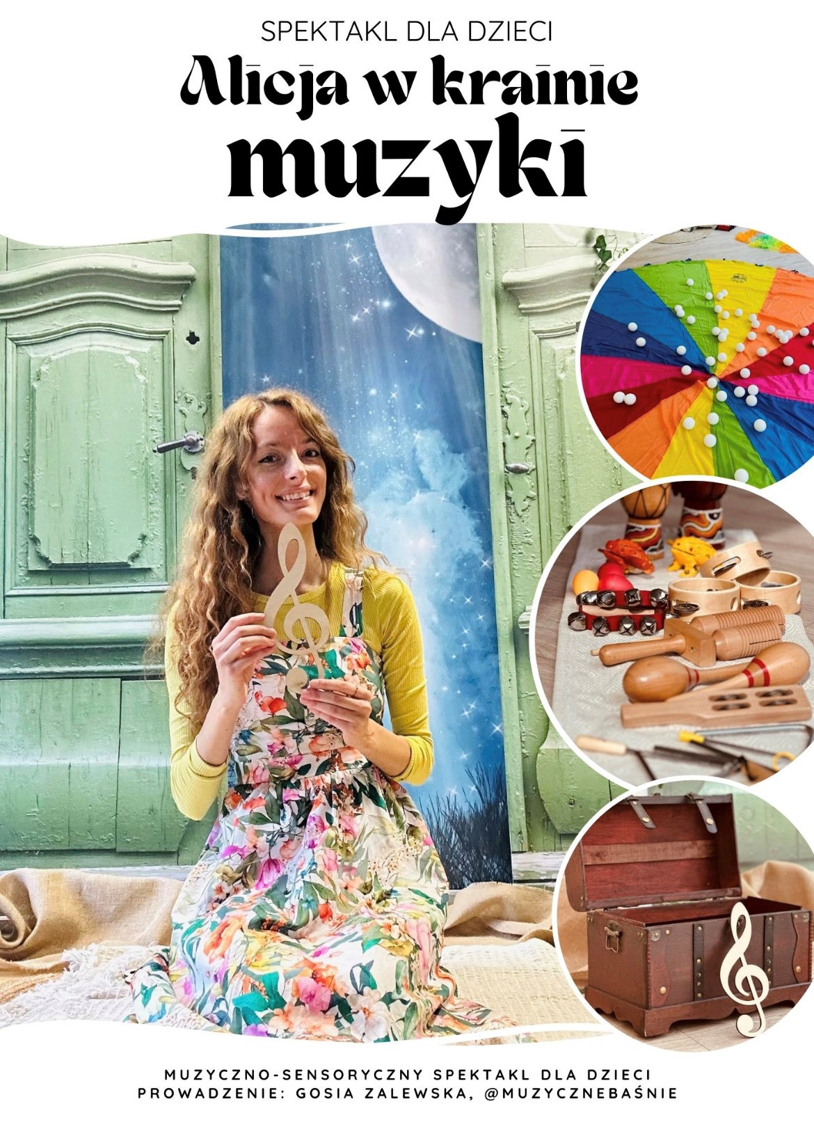 Prowadząca Gosia Zalewska, prowadzi autorski projekt Muzyczne Baśnie i jest rytmiczką. Na co dzień pracuje w przedszkolach towarzysząc dzieciom w odkrywaniu muzyki.