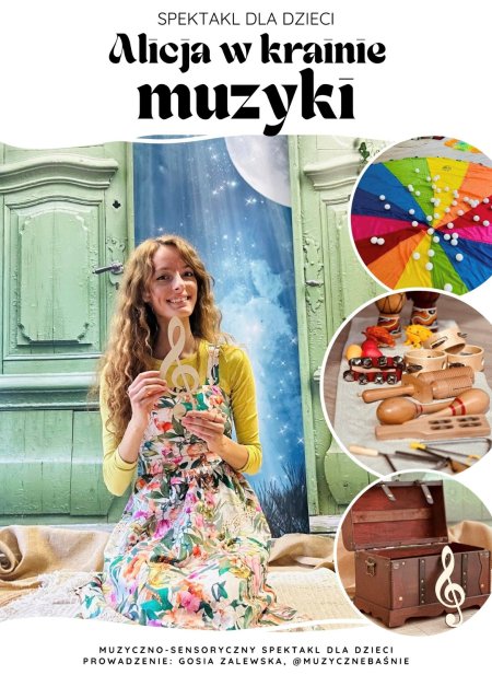 Mała Alicja uwielbia słuchać muzyki. Zarówno tej płynącej z natury, jak i dźwięków z winylowych płyt. Skąd się bierze muzyka? I jak to jest, że na świecie powstają ciągle nowe melodie? Z taką myślą dziewczynka kładzie się spać i we śnie trafia do Świata Muzyki. Niestety przybywa tam w trudnym momencie, bo mieszkańcy borykają się z pewnym problemem - przestała powstawać nowa muzyka – zatrzasnęły się drzwi do Krainy Wyobraźni… Alicja deklaruje swoją pomoc, otrzymuje wskazówki i mapę i wyrusza w wyjątkową podróż po Świecie Muzyki. Odwiedza krainę Pana Basowego, krainę Pani Wiolinowej i Krainę Metronomu. W każdej z nich (wraz z dziećmi, które oglądają spektakl) uczestniczy w muzycznych aktywnościach, w zamian za co otrzymuje artefakty (klucz wiolinowy, klucz basowy, metronom). Czy uda jej się otworzyć drzwi do Krainy Wyobraźni? Tego dowiedzą się z pewnością uczestnicy spektaklu.