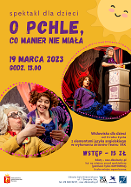 „O pchle co manier nie miała” to barwny spektakl dla dzieci od trzeciego roku życia z elementami języka angielskiego w wykonaniu aktorów Teatru TAK. Opowiada o wielkiej damie, która posiada wszystko, poza kulturą osobistą. Inspirowany jest tekstem „Pchła Szachrajka” Jana Brzechwy.