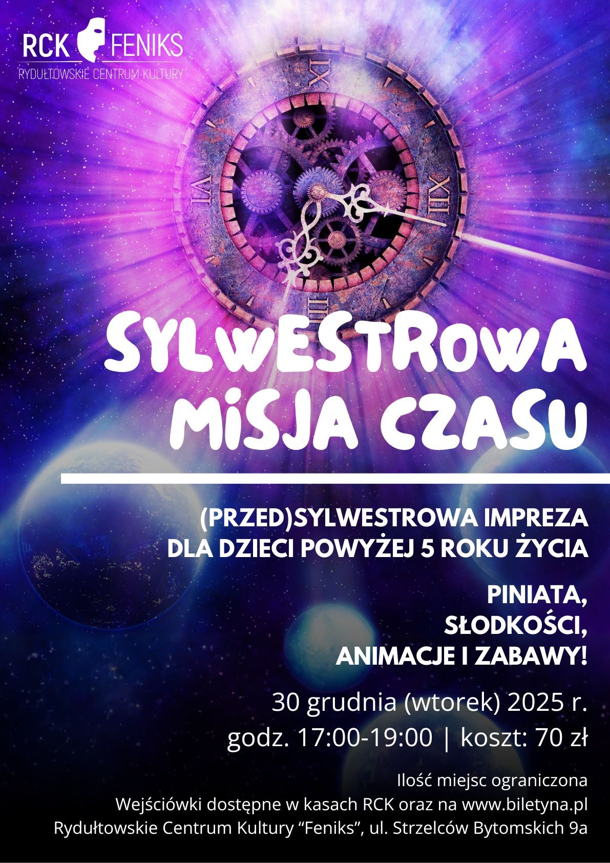 Zapraszamy wszystkie dzieci powyżej 5. roku życia na wyjątkową, pełną przygód Sylwestrową Misję Czasu! Tego dnia Rydułtowskie Centrum Kultury „Feniks” zamieni się w miejsce pełne zabawy, tańca i niespodzianek, a nad wszystkim czuwać będą doświadczeni animatorzy.