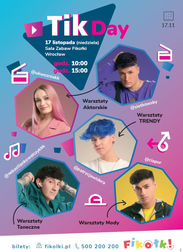 Zakup biletu na Tik Day z Gwiazdami (Event) jest jednoznaczny z wyrażeniem zgody, bez konieczności ponoszenia jakichkolwiek dodatkowych opłat ze strony Organizatora, na dokumentację Eventu oraz wykorzystanie wizerunku jego uczestników w celu: realizacji i publikacji materiałów filmowych z Eventu, fotograficzne dokumentowanie Eventu. Wykorzystywanie materiałów filmowych i zdjęć dotyczyć będzie promocji i reklamy Eventu, a także promocji i reklamy kolejnych przedsięwzięć Organizatora. Administratorem wykorzystanych danych w postaci wizerunku wszystkich uczestników jest spółka Sale Zabaw Fikołki Sp. z o.o. Pełne informacje dotyczące informacji o ochronie i przetwarzaniu danych osobowych dostępne są pod linkiem: https://fikolki.pl/pl/informacja-o-ochronie-i-przetwarzaniu-danych-osobowych .