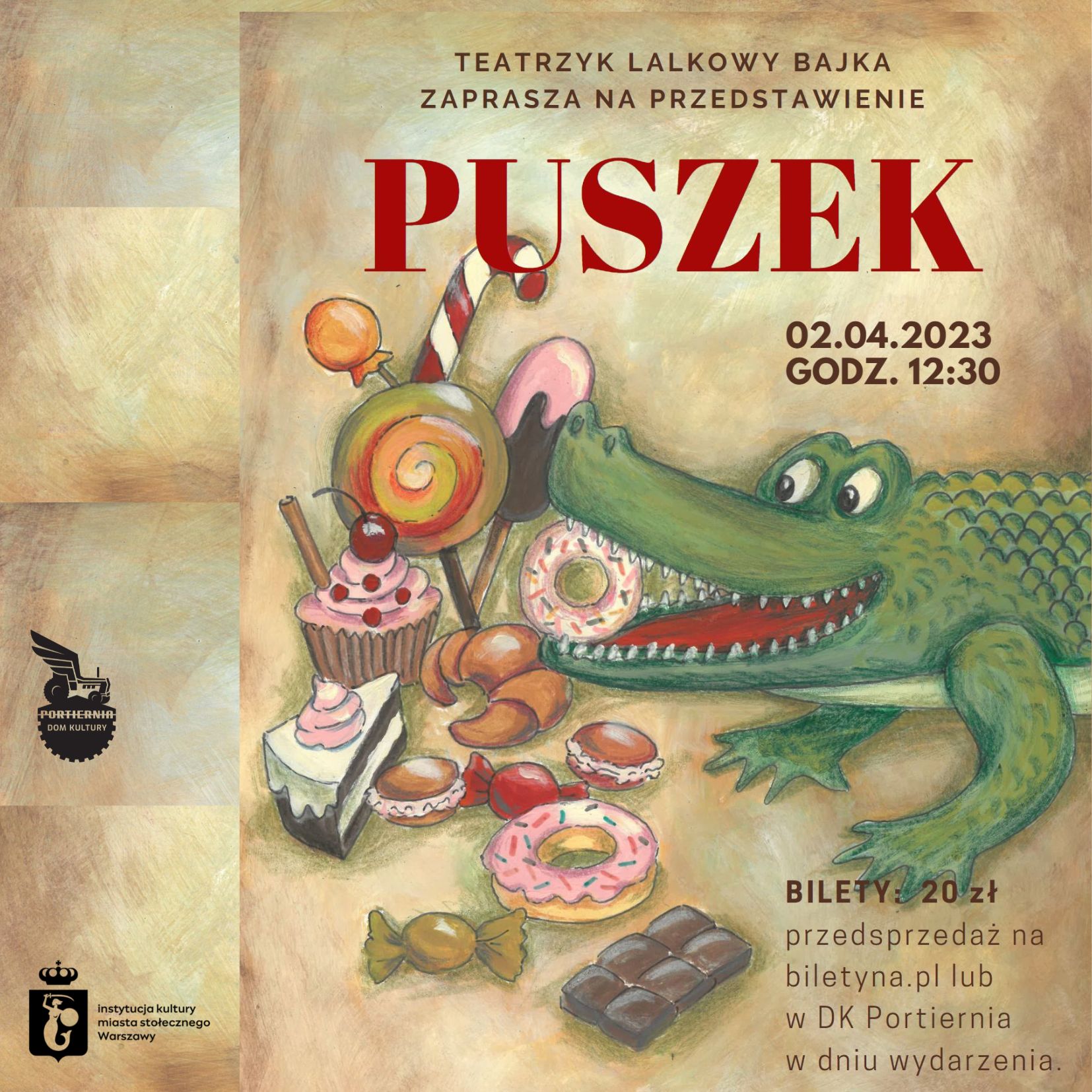 Puszek, mały krokodylek mieszka daleko stąd, w tajemniczej, egzotycznej dżungli i… żywi się wyłącznie słodkimi kokosankami. I niestety – z powodu swojej ogromnej słabości do tych łakoci – pewnego dnia dopada go straszny ból zęba. I tu zaczyna się historia, bowiem wrażliwy Puszek panicznie boi się wizyty u doktora. Na pomoc jednak przychodzą mu pomysłowi przyjaciele, którzy mają swoje recepty na przyniesienie ulgi obolałemu kumplowi. Czy okażą się skuteczne? Dowiecie się, oglądając przedstawienie o Puszku.