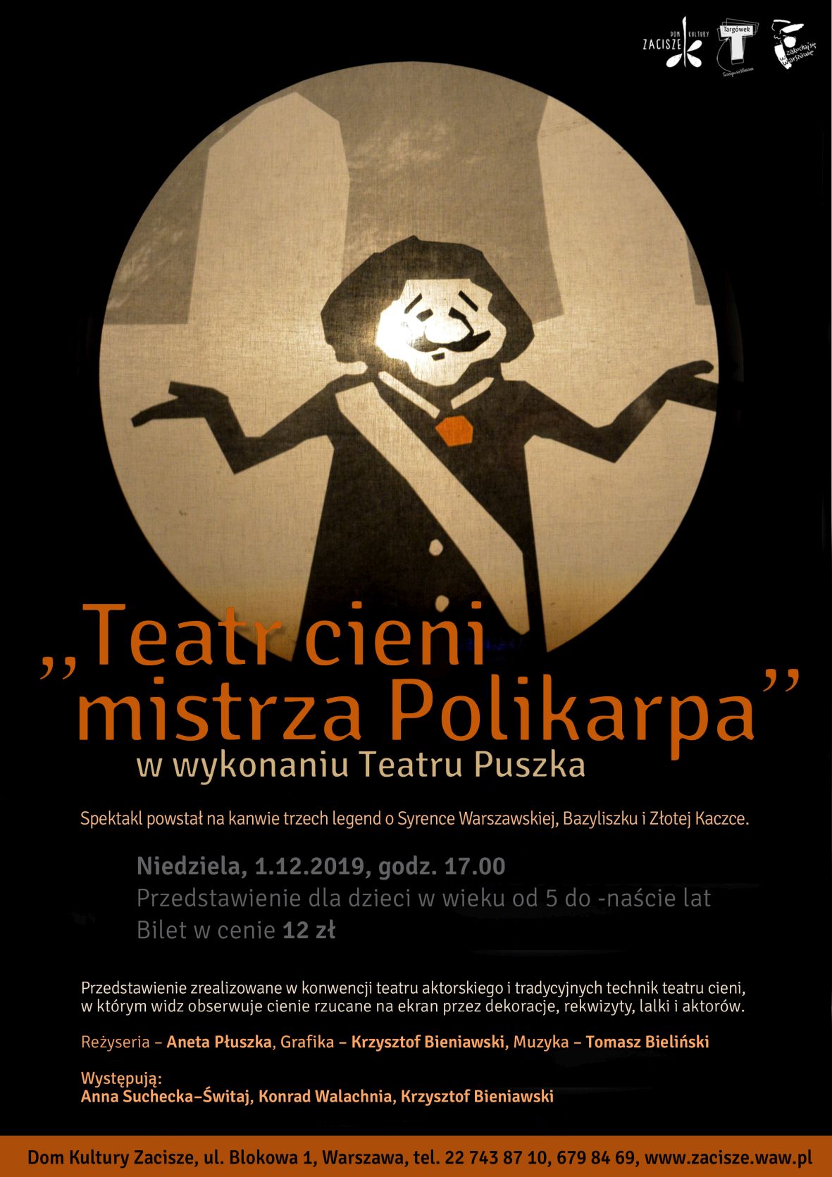 Mało kto wie, że są na świecie cienie, które do nikogo nie należą. Cienie samotne, zagubione i zupełnie niczyje. Takie właśnie opuszczone cienie zbiera niezwykły kolekcjoner: mistrz Polikarp. Przygarnia je i daje schronienie. A cienie odwdzięczają mu się opowiadając baśnie, legendy i historie z odległych czasów. Bo cienie nie mają wieku. Istnieją od zawsze i pamiętają to, co zdarzyło się dawno, dawno temu. A dawno, dawno temu nie było filmu ani wideo, ani telewizji, ani kin. Ludzie snuli opowieści przy blasku świec czy księżyca. Teatr cieni mistrza Polikarpa przywołuje tę atmosferę i w magiczny sposób zabiera widzów w odległy świat legend warszawskich.